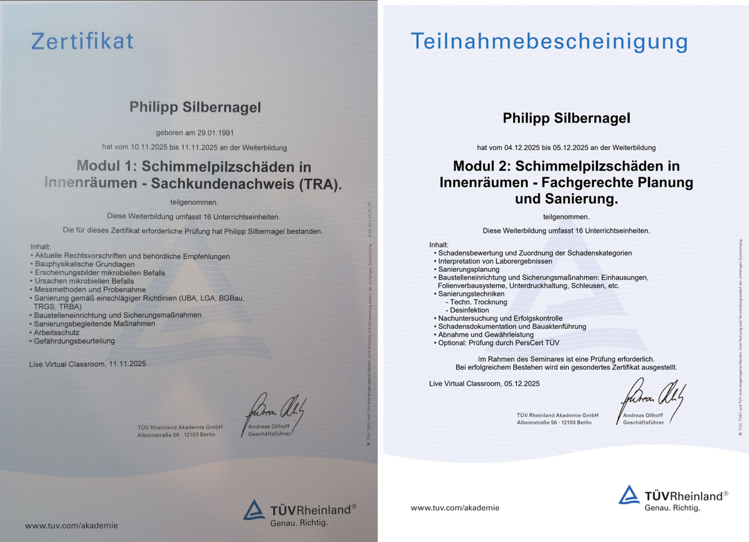 Philipp Silbernagel hat die Prüfung für Schimmelpilzschäden in Innenräumen - Sachkundenachweis beim TÜV Rheinland erfolgreich bestanden und auch das Fachwissen für die fachgerechte Planung und Sanierung von Schimmelpilzschäden nachweislich erworben. Das Wissen fließt in unsere Produktentwicklung und Beratung ein.
